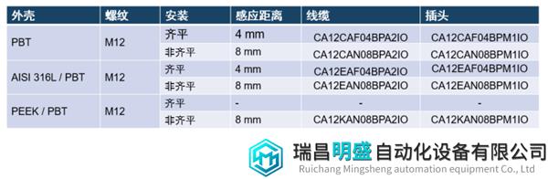 新系列的CA12智能电容传感器机身外壳采用了多种材料,不锈钢外壳具有优良的耐腐蚀性和机械强度,适用于高温、高湿、强腐蚀等恶劣环境。PEEK(聚醚醚酮)塑胶原料是芳香族结晶型热塑性高分子材料,具有机械强度高、耐高温、耐冲击、阻燃、耐酸碱、耐水解、耐磨,油墨不会粘在PEEK材料表面从而影响传感器的正常检测。PBT(聚对苯二甲酸丁二醇酯)作为一种高性能的工程塑料,具有良好的机械性能,较高的硬度、刚性和强度,同时还具有良好的耐热性和耐腐蚀性。